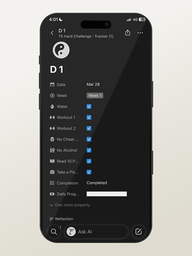 75 Day Hard Challenge by Andy Frisella – Gym Tracker with Checklist for iPhone – Notion Template – No Excuse Edition