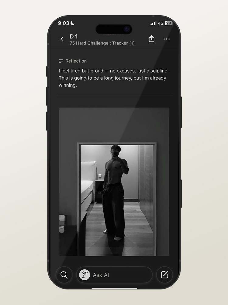 • A dedicated daily space where users write how they felt that day (energy, mindset, struggles, wins).